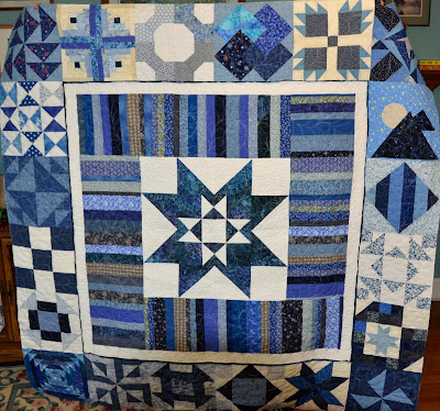 For the center medallion star, I put big swirls in the blue areas. I wanted to do some close quilting in the white areas so they would recede to the background. I decided to do pebble stippling, a decision later to be classified in the "What Was I Thinking?" category.